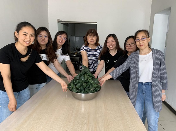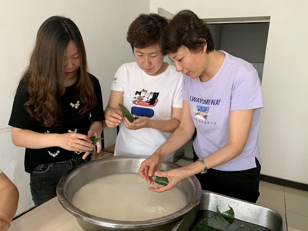 上午9點,粽葉、糯米、大棗整齊地擺上桌。大家邊包邊聊,其樂融融。在包粽子現(xiàn)場,熟悉包粽子的能手們飛快地拿起粽葉,兩手一窩卷成漏斗狀,填米、加棗、壓緊、扎繩,一氣呵成。她們還充當(dāng)起“老師”的角色,教“新手”職工包粽子,手把手現(xiàn)場教學(xué),“老師”教得仔細,“學(xué)生”學(xué)得認(rèn)真,但要做出餡料十足、外觀漂亮的粽子還是需要費一番功夫的。隨著技巧的不斷嫻熟,一個多小時的時間,形狀各異、大小不一的一百多個粽子就堆積成山了,預(yù)算科副科長竇夢娜說:“我們包粽子的水平真是越來越高了,明年再包會更好!”此時每個人心里都洋溢著一股喜悅之情,有初學(xué)一門手藝的欣喜,有參與集體活動交流感情的滿足。