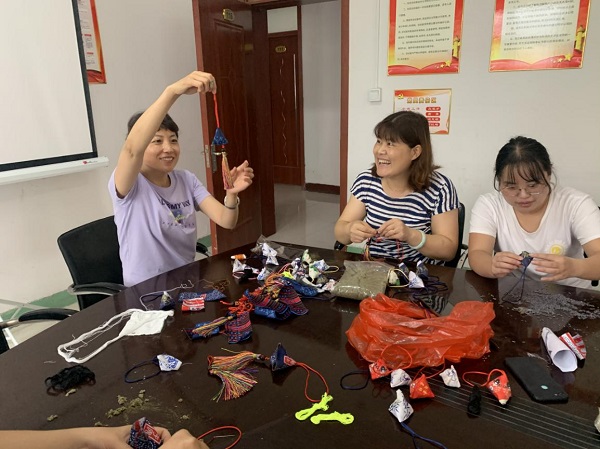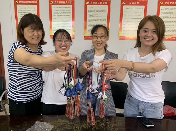 在傳統(tǒng)習(xí)俗中,玲瓏可愛的各色香包也是端午節(jié)必不可少的元素。包完粽子后大家轉(zhuǎn)移陣地到了活動室,大家圍坐桌邊,面前堆放著一份份材料包,有棉布、艾草、針線、中國結(jié)流蘇。面對這個從來沒有做過的DIY,大家開始研究起來,有的用手機搜索縫制方法流程,有的直接比來比去親自摸索著縫起來。有職工說:“這有點像咱們小時候老人們縫的毽子,那個里面裝的是五谷雜糧,咱們現(xiàn)在裝的是艾草?!薄斑@香囊可以掛在辦公室或者車上,有清香、驅(qū)蚊的功效。”“我算是知道了,這個流蘇應(yīng)該縫在這個邊的中間,而不是角上……”大家你一句我一句,手中的針線穿梭在棉布間,用密密的針腳縫制出傳統(tǒng)佳節(jié)最好的注解,用絲絲線線纏繞出端午安康的美滿寓意,一個個精巧可愛的三角香囊在大家的努力下完美呈現(xiàn)。