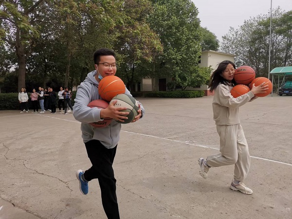 “誰先來?抱球游戲升級——1人抱4個(gè)籃球向前奔跑,過程中一個(gè)球也不得落地,否則成績無效。”裁判之一的審計(jì)科長談增迫不及待地宣布。“個(gè)子高的胳膊、腿長,有優(yōu)勢,先上。”人群里有人提議,工程科身高一米八的帥小伙劉文浩和綜合辦高個(gè)子王春影舉手示意,跑道上呈現(xiàn)二人灑脫、漂亮的抱球姿勢。
