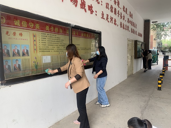 院內(nèi)整理清掃完畢后,大家又轉(zhuǎn)移陣地到辦公樓內(nèi),對辦公室、廁所、樓道等區(qū)域進行了打掃。黨員們充分發(fā)揚“甩開膀子、挑起擔子”的精神,擦拭玻璃、打掃地面、清理垃圾,全方位消毒噴殺,每一步都認真到位,不留死角。經(jīng)過近三個小時的辛勤勞動,院里綠化帶的枯枝、雜草得到了整治,機關大院內(nèi)更加整潔美觀,環(huán)境煥然一新。機關辦公室窗明幾凈、一塵不染,所有衛(wèi)生死角被徹底清理。大家擦擦汗水,露出會心的微笑。