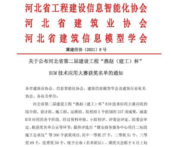 7月14日,河北省第二屆建設工程“燕趙(建工)杯”BIM技術應用大賽獲獎名單揭曉,公司參賽的7項成果全部獲獎,其中一等獎2項、二等獎2項、三等獎3項。