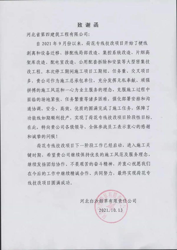 一紙致謝函,字字鼓人心!10月13日,三分公司中煙項目部收到業(yè)主河北白沙煙草有限責任公司發(fā)來的致謝函,感謝項目部克服場地緊張、任務(wù)重等諸多困難,圓滿完成施工任務(wù),實現(xiàn)了荷花專線技改項目階段性目標。