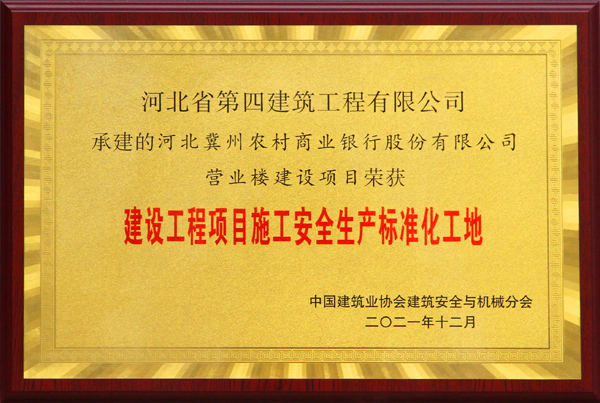 2021年12月22日,公司收到中國建筑業(yè)協(xié)會(huì)安全與機(jī)械分會(huì)下發(fā)的文件,我公司施工的河北冀州農(nóng)村商業(yè)銀行股份有限公司營業(yè)樓建設(shè)項(xiàng)目喜獲全國安全生產(chǎn)標(biāo)準(zhǔn)化工地,這是公司第9次獲得此項(xiàng)榮譽(yù)。