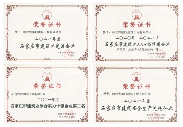 近日,公司在建筑施工領(lǐng)域再獲表彰。經(jīng)專(zhuān)家組嚴(yán)格評(píng)審,石家莊市建筑協(xié)會(huì)研究決定,授予公司2021年度“石家莊市建筑業(yè)綜合實(shí)力十強(qiáng)企業(yè)”“石家莊市建筑業(yè)AAA級(jí)信用企業(yè)”“石家莊市建筑業(yè)先進(jìn)企業(yè)”“安全生產(chǎn)先進(jìn)企業(yè)”,四項(xiàng)榮譽(yù)在獲獎(jiǎng)榜單中均名列前茅。同時(shí),張新煜被評(píng)為“優(yōu)秀企業(yè)經(jīng)理”、梁復(fù)被評(píng)為“優(yōu)秀安全總監(jiān)”、陳增順被評(píng)為“優(yōu)秀總工程師”、李青等22人被評(píng)為“優(yōu)秀項(xiàng)目經(jīng)理”,聶玉朝等2人被評(píng)為“安全生產(chǎn)先進(jìn)工作者”。