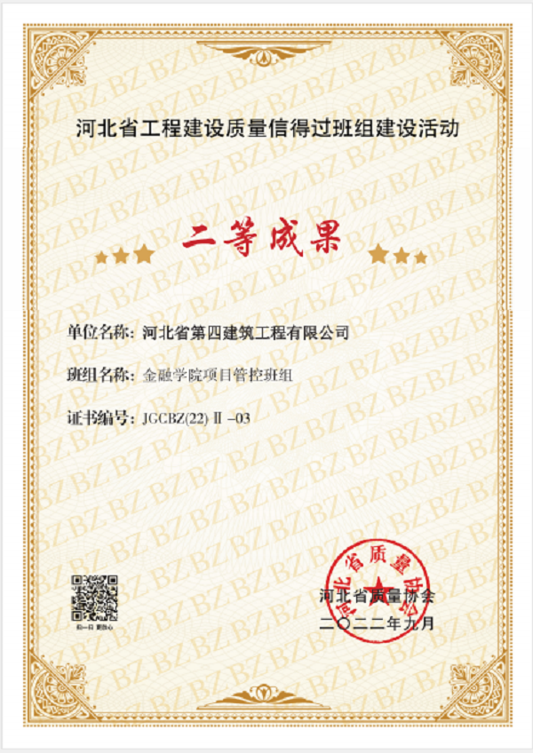 9月16日,六分公司收到了河北省質(zhì)量協(xié)會(huì)頒發(fā)的證書,河北金融學(xué)院項(xiàng)目管控班組榮獲“河北省工程建設(shè)質(zhì)量信得過(guò)班組建設(shè)活動(dòng)”二等成果,并被推薦到中國(guó)建筑業(yè)協(xié)會(huì)交流。