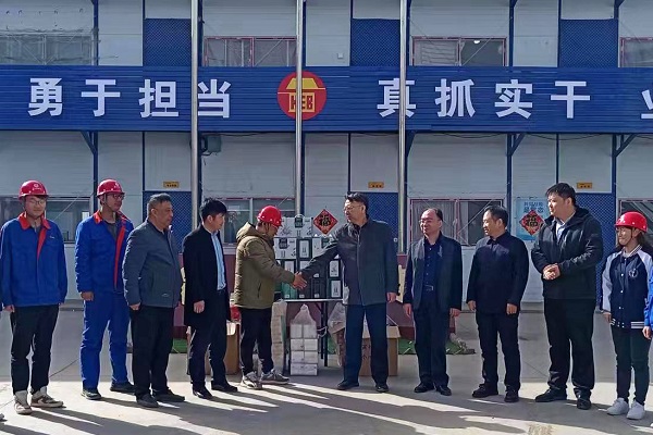 在會議室,唐志強聽取了項目基本情況匯報,詳細了解職工生產(chǎn)生活、勞動防護等方面情況。隨后深入施工現(xiàn)場,查看職工工作環(huán)境并與職工交流,傾聽一線職工聲音。C型料場正在進行擋墻主體施工,他叮囑現(xiàn)場管理人員高度注意安全,防止高空墜落。來到項目辦公區(qū),院內(nèi)墻壁上“誠信守責、勇于擔當、真抓實干、業(yè)績服人”的工作總要求顯得格外醒目,“大家遠離家鄉(xiāng),在一線兢兢業(yè)業(yè),工作辛苦了,我代表公司工會來看望你們……”他向每位職工送上保溫杯、牛奶等慰問品,“內(nèi)蒙古風沙大,最近天氣冷,大家一定要注意保暖……”他和職工一一握手問好,并送上殷切關(guān)懷。