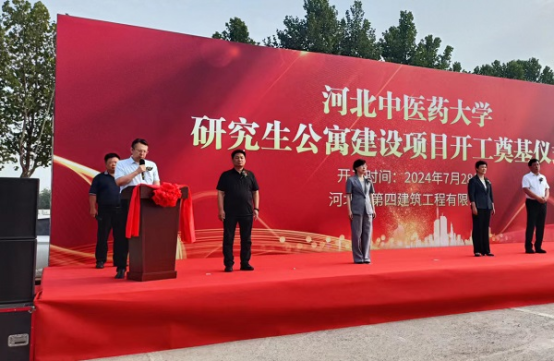 奠基儀式現(xiàn)場(chǎng),挖掘機(jī)、裝載機(jī)身披大紅花整齊排列,猶如即將出征的戰(zhàn)士,工人整裝待發(fā),信心滿滿、斗志昂揚(yáng)。儀式在歡快激昂的樂曲聲中拉開序幕。主持人首先介紹了參加本次儀式的相關(guān)領(lǐng)導(dǎo)和項(xiàng)目概況。隨后,唐志強(qiáng)作為施工單位代表首先發(fā)言,“我公司有幸承接該施工任務(wù),充分體現(xiàn)了項(xiàng)目主管部門和建設(shè)單位對(duì)我們國有建筑企業(yè)的信任和支持。河北四建一定高標(biāo)準(zhǔn)、嚴(yán)要求,為項(xiàng)目順利實(shí)施提供有力保證,為業(yè)主提供滿意服務(wù),為河北中醫(yī)藥大學(xué)醫(yī)學(xué)教育的高質(zhì)量發(fā)展貢獻(xiàn)力量!”最后,學(xué)校黨委副書記孫士江表示,河北中醫(yī)藥大學(xué)研究生公寓為省政府支持骨干大學(xué)建設(shè)項(xiàng)目,希望參建各方全力以赴確保按時(shí)完工投入使用,建設(shè)“品質(zhì)工程”“一流工程”,促進(jìn)學(xué)校各項(xiàng)事業(yè)取得新成就,為經(jīng)濟(jì)強(qiáng)省、美麗河北建設(shè)作出新的更大貢獻(xiàn)!