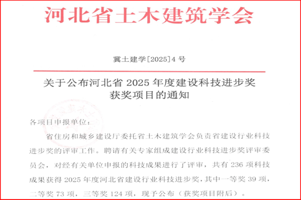 7月3日,河北省土木建筑學會公布了2025年度河北省建設科技進步獎名單。公司憑借扎實的科技創(chuàng)新與技術攻關能力,一舉斬獲16項科技成果獎項,其中,一等獎1項、二等獎4項、三等獎11項。