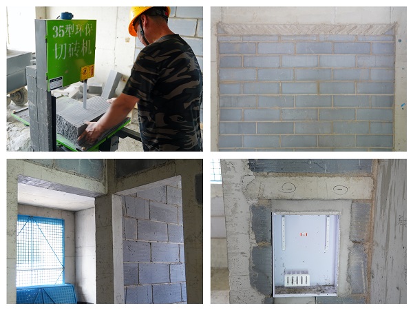 在材料利用與成本控制方面,項(xiàng)目團(tuán)隊(duì)探索出了“更優(yōu)解”。針對頂部斜砌施工,項(xiàng)目部原計(jì)劃采購混凝土預(yù)制塊進(jìn)行砌筑,但在論證中發(fā)現(xiàn)采購的預(yù)制塊存在成本高、運(yùn)輸損耗大、工序銜接慢等弊端。經(jīng)過反復(fù)研討,項(xiàng)目團(tuán)隊(duì)決定就地取材,利用現(xiàn)場加氣混凝土砌塊施工剩余的裁切廢料,通過定型化切割模具進(jìn)行精準(zhǔn)切割,替代外購預(yù)制塊。為保障方案順利實(shí)施,項(xiàng)目部提前抽調(diào)技術(shù)嫻熟的切割工,組織加氣塊切割專項(xiàng)培訓(xùn),同時(shí)提前安裝調(diào)試好40余臺高精度切割設(shè)備,現(xiàn)場切割作業(yè)得以高效展開。這一創(chuàng)新方法的運(yùn)用,將加氣塊材料的現(xiàn)場利用率提高到90%以上,其切割面更加平整,有效保障了斜砌質(zhì)量和結(jié)構(gòu)整體性,提升了觀感效果。
