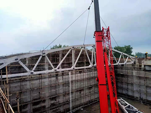 5#平房倉的倉頂由16榀預應力屋架梁和400塊屋面板構成,每榀預應力屋架梁重14.24噸,長度達30米,平房倉的工作重點是預應力屋架梁的制作及吊裝,工作難度大、技術含量高,項目部緊抓屋架梁預制這道關鍵工序,提前謀劃,做好準備。