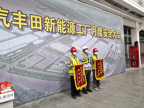 會上,業(yè)主對所有參建單位自開工以來的安全管理情況進行了總結(jié),對兩家先進集體和兩名先進個人進行了表彰。天津一汽樹脂車間項目部由于規(guī)范嚴謹?shù)墓芾恚诒姸嗍┕挝恢忻摲f而出,榮獲“五月份安全施工模范單位”錦旗;項目安全員王喜峰榮獲“優(yōu)秀安全員”榮譽稱號。日方課長督查佐藤和一汽豐田汽車總部副總經(jīng)理相馬清親對天津一汽新能源工廠項目部安全工作給予了表彰,項目經(jīng)理苗建偉在會上做交流發(fā)言,介紹了項目施工安全管理經(jīng)驗。