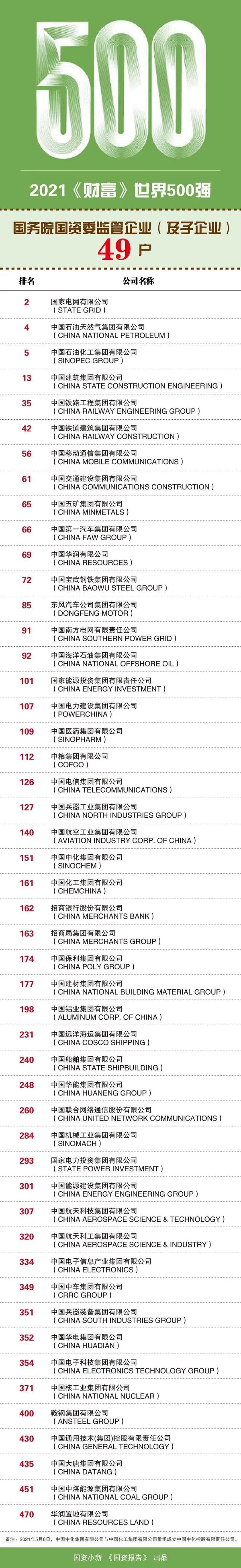 2021年度國務院國資委監(jiān)管的49家入圍世界500強的中央企業(yè)(及子企業(yè))完整名單